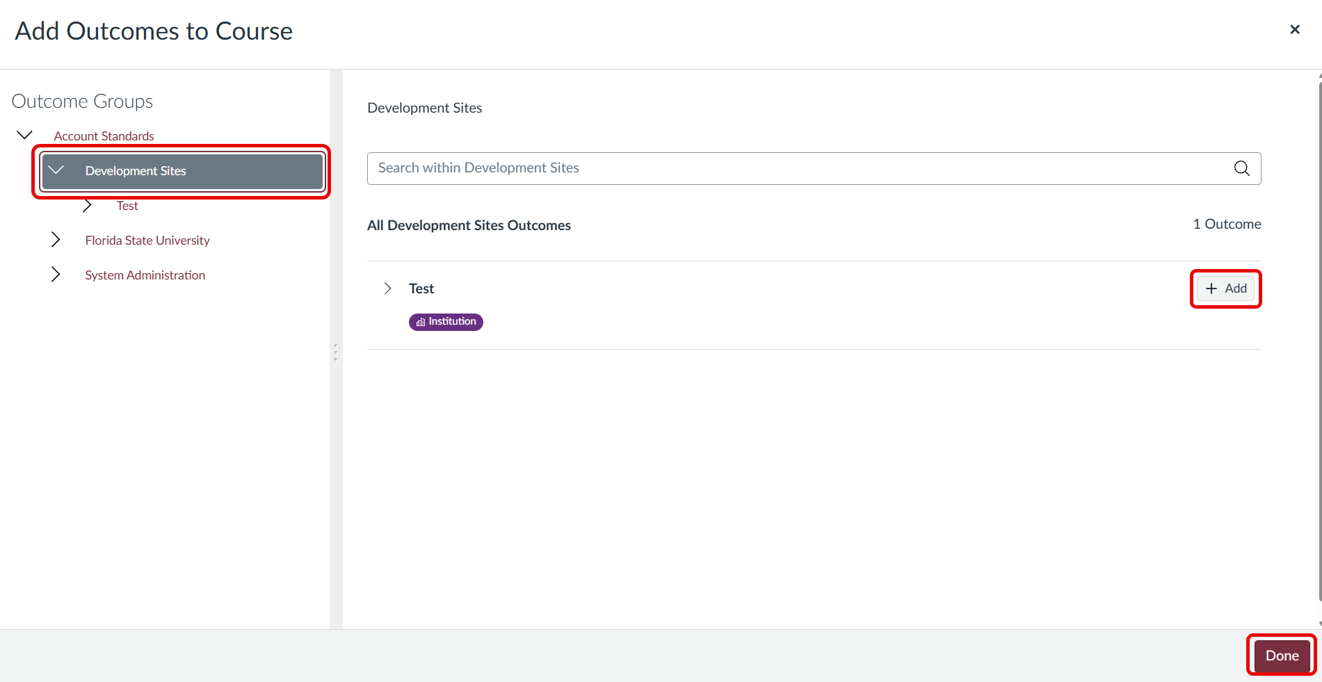 - The "Find Outcomes" window contains two frames. The left frame displays different Outcome groupings. The right frame will display both Outcome groupings and specific Outcomes. Select the group names and specific Outcomes in the left and middle frames to locate the specific Outcome you wish to add to your course. Once you have located the specific Outcome, click the + Add button to add it to your course. Click the garnet Done button in the bottom right corner to save the connection.