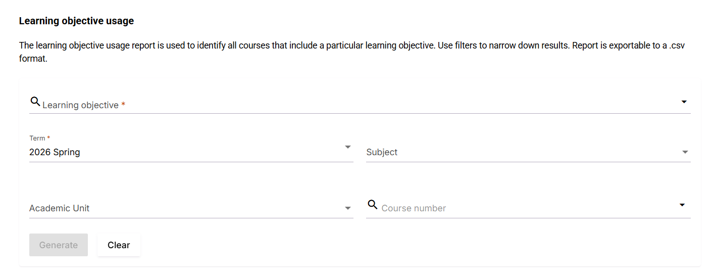 Learning objective usage: The learning objective usage report is used to identify all courses that include a particular learning objective. Use filters to narrow down results. The report is exportable to a CSV format.