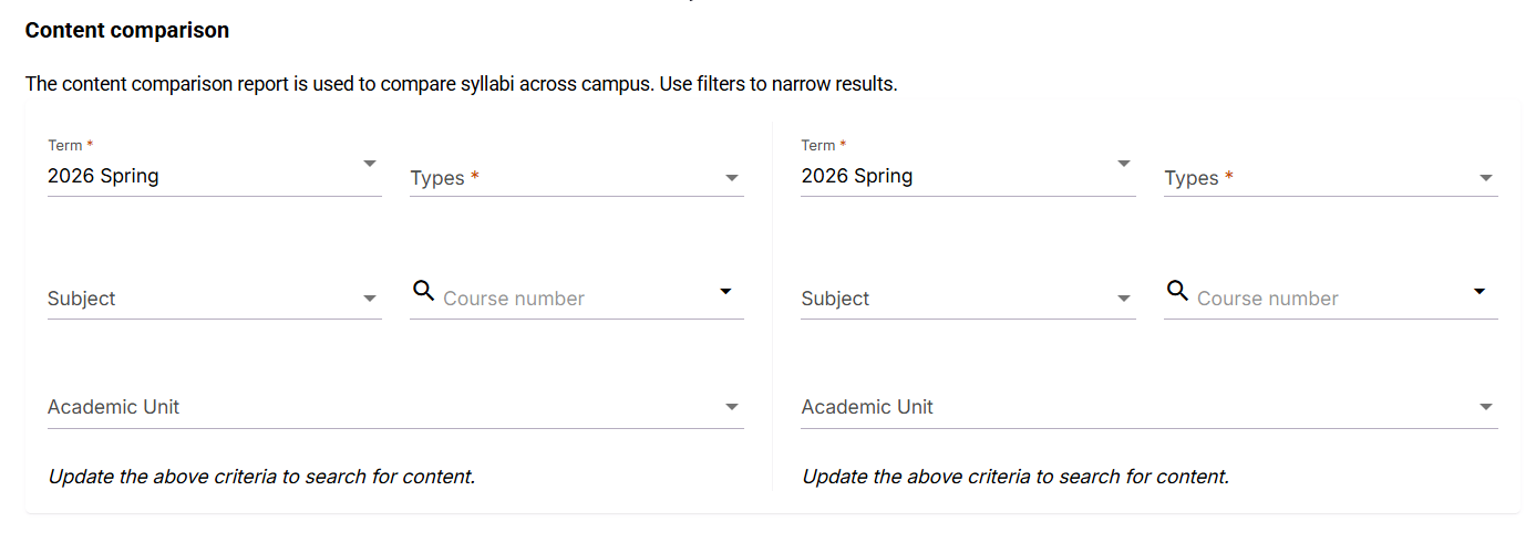 Content comparison: The content comparison report is used to compare syllabi across campus. Use filters to narrow results.