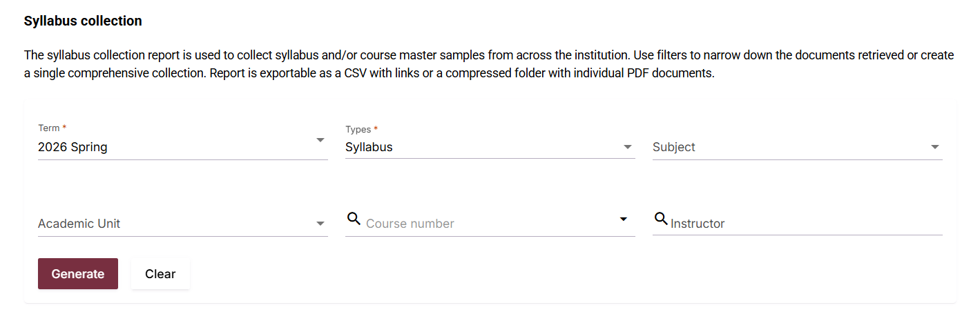 Syllabus collection: The syllabus collection report is used to collect syllabus samples from across the institution. Use filters to narrow the retrieved documents or create a single comprehensive collection. The report can be exported as a CSV file with links or as a compressed folder containing individual PDF documents. Select generate to generate a report on this and all other reports.