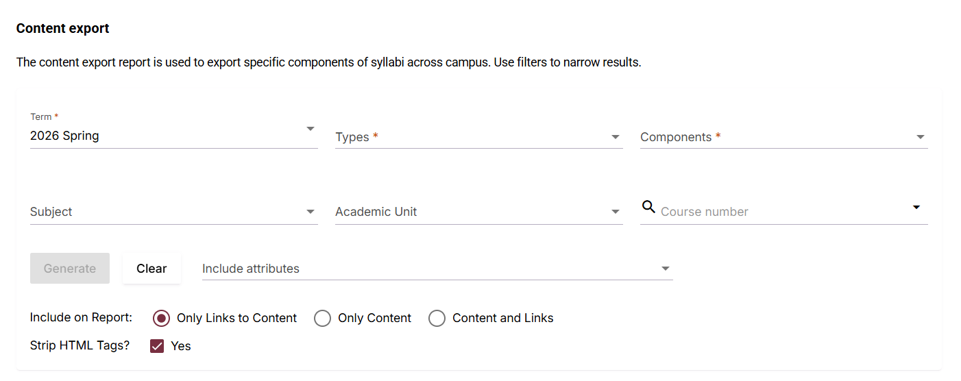 Content export: The content export report is used to export specific components of syllabi across campus. Use filters to narrow results.